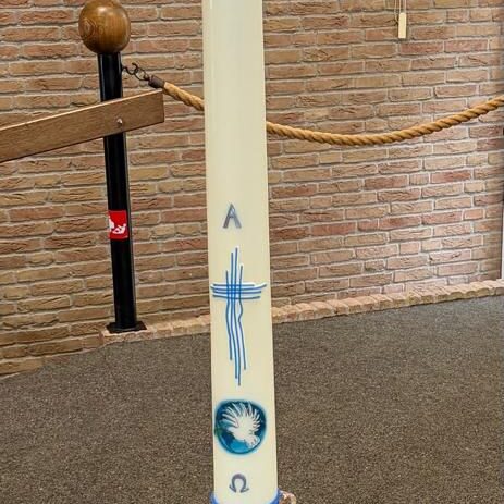 Op de Eerste Paasdag is tijdens de ochtenddienst de nieuwe paaskaars aangestoken. De afbeeldingen op deze paaskaars symboliseren…